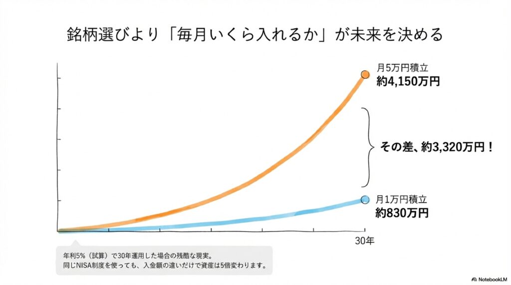 銘柄をどう選ぶかより、毎月いくら入れるかの方が、最終的な資産額に直結している。これがNISAの本質です。