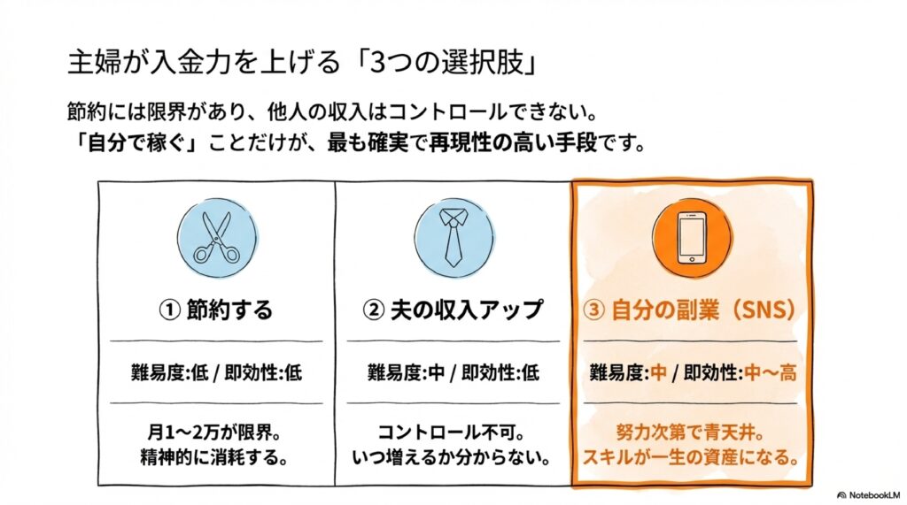 | ② 配偶者の収入アップを促す | 中 | 低 | 不確実 | 自分でコントロールできない |