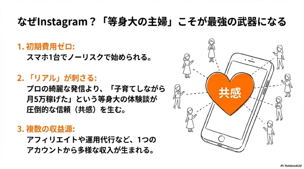 主婦のリアルな発信——「子育てしながらでも月5万稼げた」「スマホ一台でここまでできた」という体験談は、同じ悩みを持つ人に圧倒的に響きます。インフルエンサーの華やかな投稿より、等身大の主婦の話の方が「私にもできるかも」と感じてもらいやすいんです。