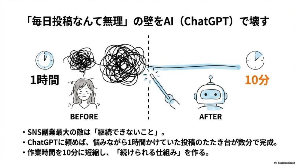「毎日投稿しなきゃ」というプレッシャーが副業を続けられなくなる最大の原因です。AIを使って、投稿を「作るのが大変なもの」から「5分で作れるもの」に変えましょう。