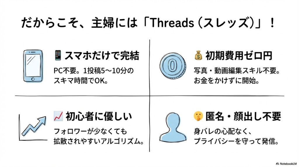 結論から言うと、主婦こそThreadsに向いています!スマホだけ・顔出し不要・スキマ時間でOKなので、育児しながら始める方が増えています。この記事で全部説明しますね。