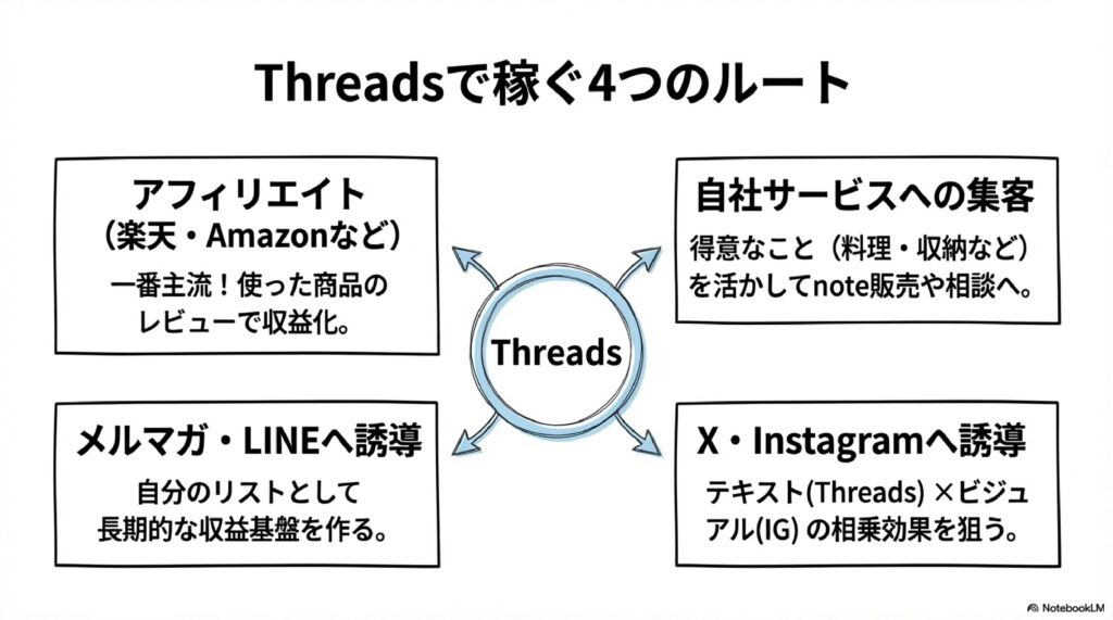Threadsをフロント(入口)として使い、フォロワーをInstagramやXに誘導。そちらのアカウントで収益化するという方法です。Threadsはテキストで価値提供しやすく、Instagramはビジュアルで商品訴求しやすいという特性があるため、両方を掛け持ちすると相乗効果が生まれます。