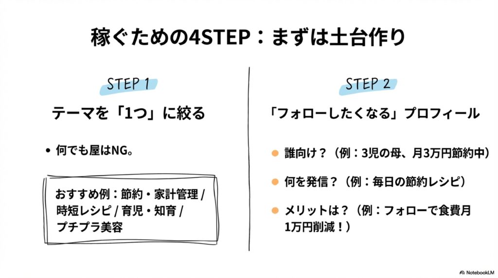 - 誰向けのアカウントか(例:3児の母 / 月3万円節約中)