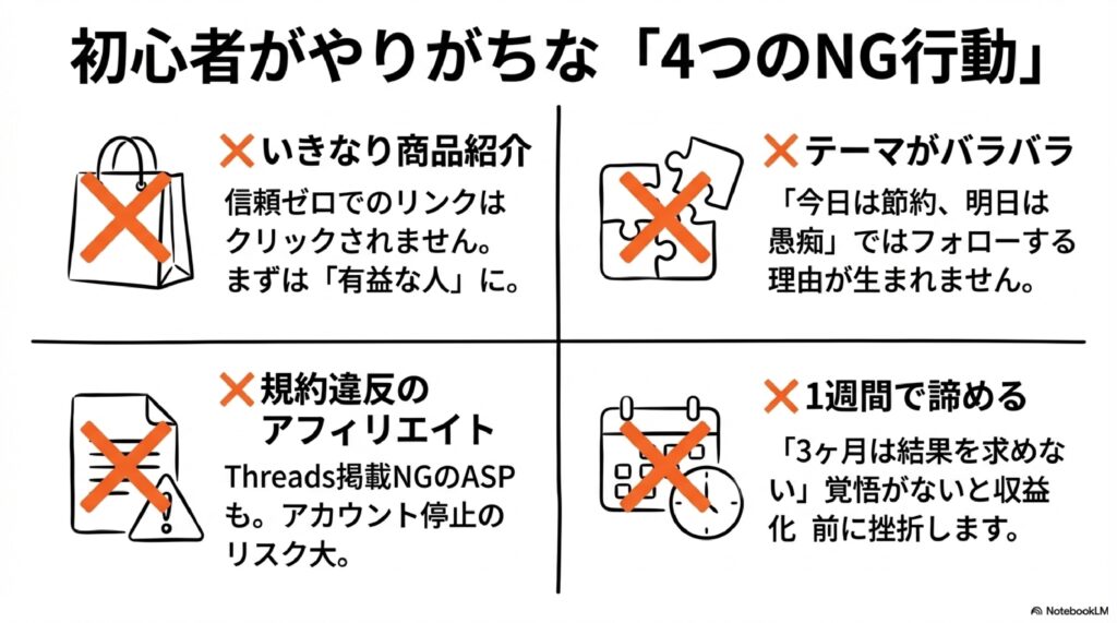 一部のASPはThreadsでの掲載を禁止しています。違反すると報酬没収やアカウント停止のリスクがあります。必ず利用規約を確認してください。